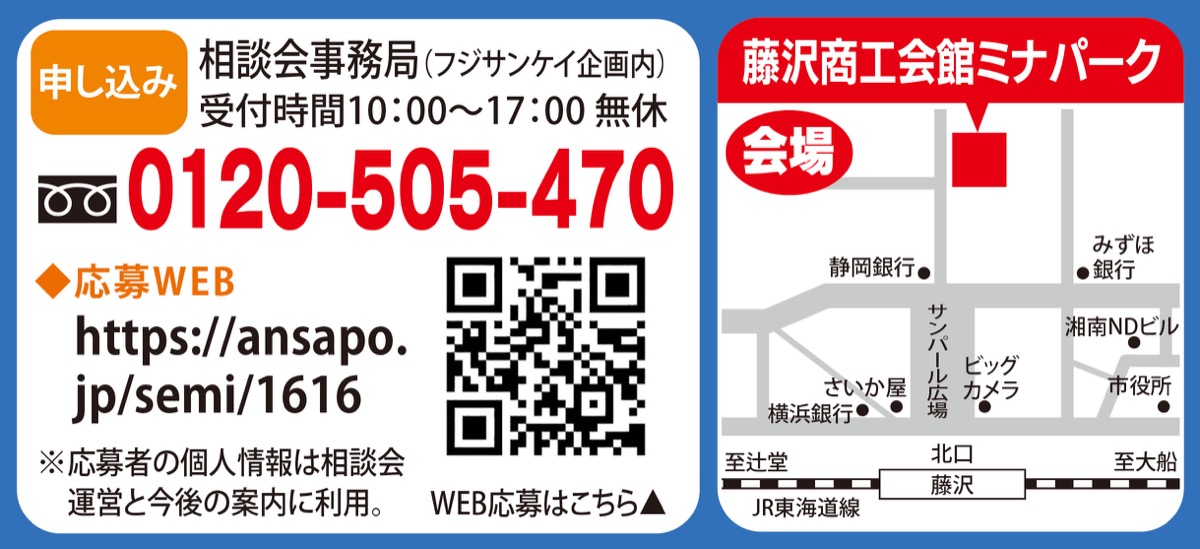 「わが家に相続税はかかるの?」「節税対策は必要?」などの疑問や遺言書の書き方・保管方法をはじめ、不動産の分割や節税対策、空き家の賢い活用方法など気軽に相談できるチャンス。予約制のため希望者は左記へ。
