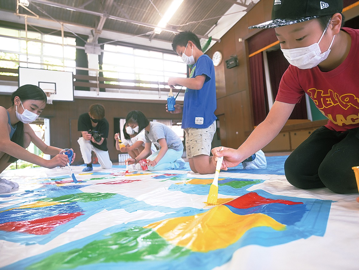 イベントには地元の子ども9人が参加。天幕のテント生地に描かれた魚とカニの下絵に、約1時間かけて色を塗った。下絵は相模湾の海の生き物をイメージ、色は五輪の5色を使った。子どもたちは筆を持つと真剣な表情で色塗りをしていた。