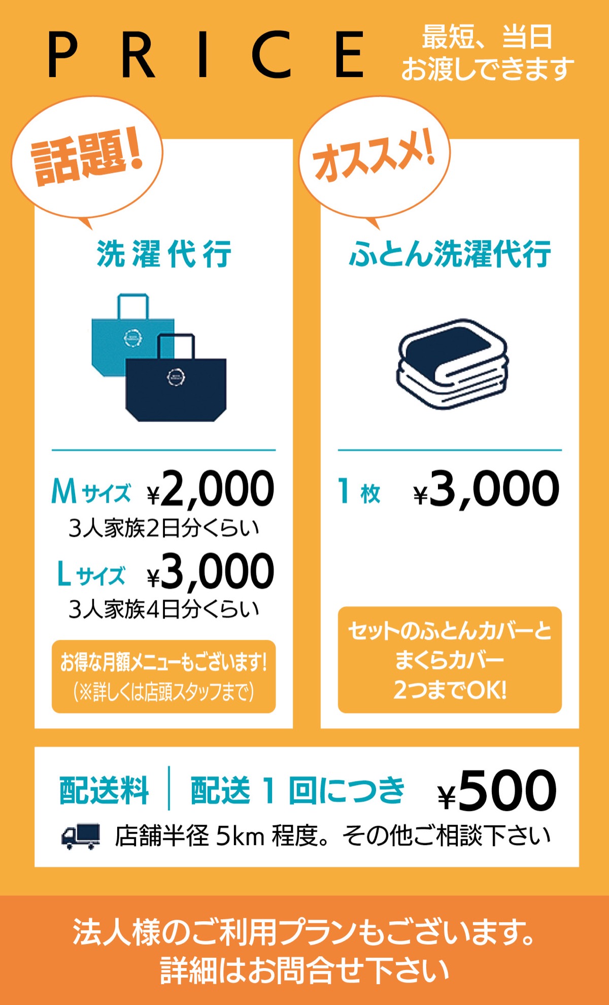 そこで同店の登場。およそ3人家族2日分(40リットル)をわずか2000円、4日分の(60リットル)を3000円で代行してくれる。出し方は、専用袋に入れて持ち込むだけ。国家資格保有者によるこだわり洗浄に加え、ウィルス対策洗剤、スキンケア柔軟剤の使用、丁寧なたたみなど嬉しいことだらけのプロのサービスを提供してくれる。