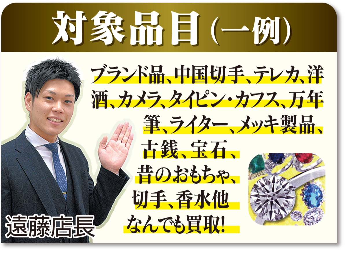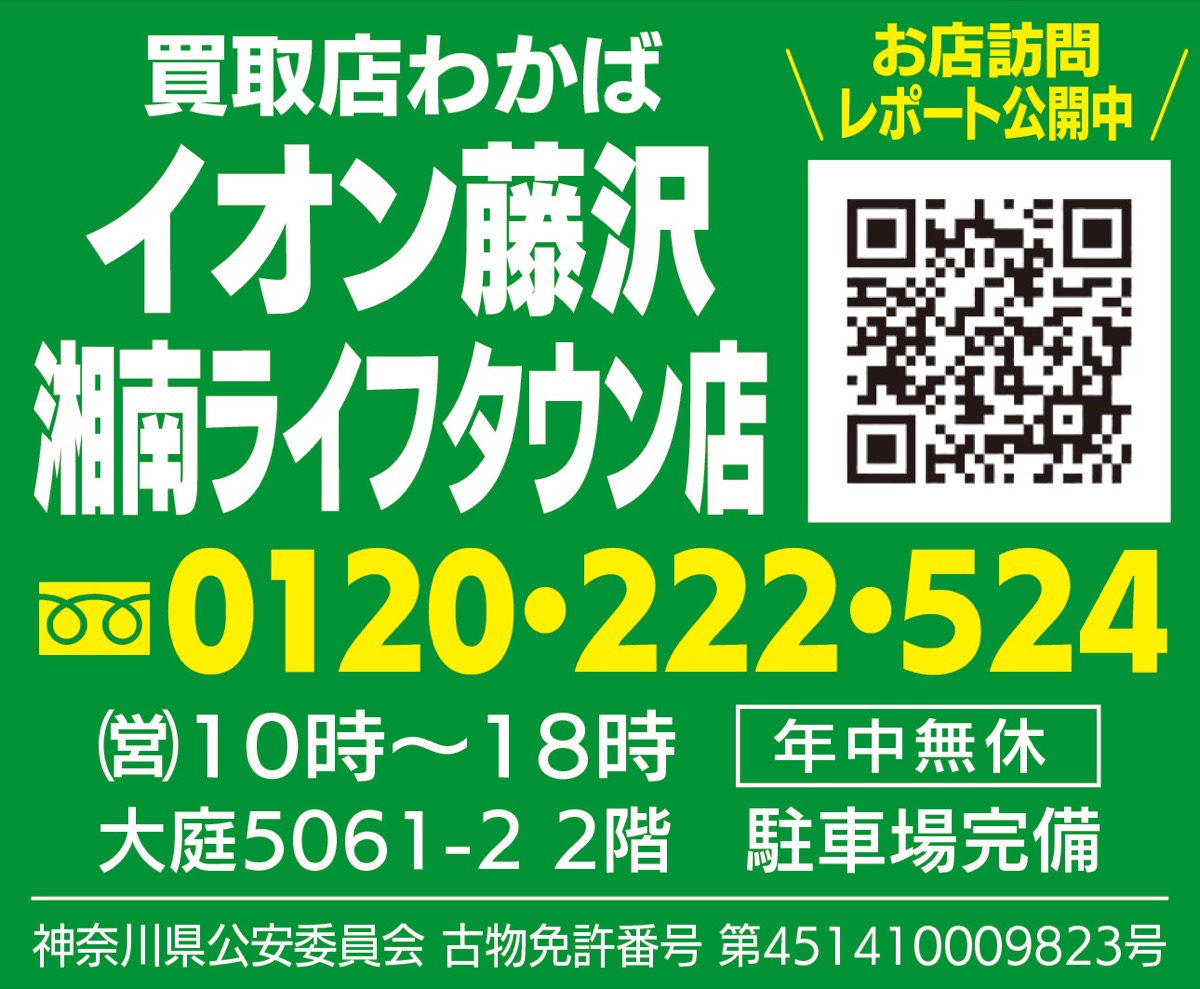 「ブランド品はどんな状態でも必ず買い取ります」と話すのは、全国100店舗以上を展開する「買取店わかば」イオン藤沢店の遠藤尚斗店長。ボロボロで壊れていても、20〜30年前の古い物も対象。「他店で買取不可だった金歯、銀歯、メッキ製品、海外製や無刻印の貴金属もお持ち下さい」。「本当に買い取ってくれるの」と思ったらまず問い合わせを。