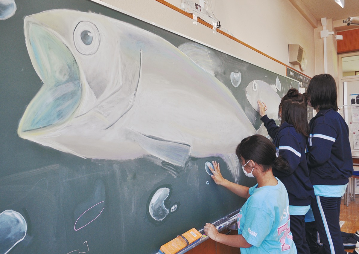 生徒は中・高の各クラスごとに制作。黒板に色とりどりの天使の羽根や魚の群れ、花、女性へのエールなど趣向をこらしたオリジナル作品を描いた。高2の生徒は「皆でアドバイスし合って取り組めた」、「一つ大きな作品を作るには、互いの思いに向き合うことが大切だと感じた」と感想を話した。