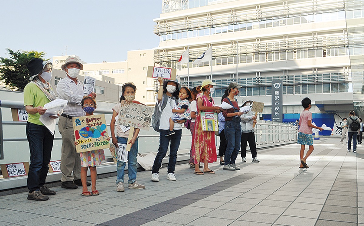 環境活動に取り組む市民からなる「気候危機アクション藤沢」が10日、藤沢市役所前で温室効果ガス排出削減を訴える街頭活動を行った。子連れの母親や高齢者などメンバーら15人がチラシを手渡しながら通行人に意識の共有を呼び掛けた。
