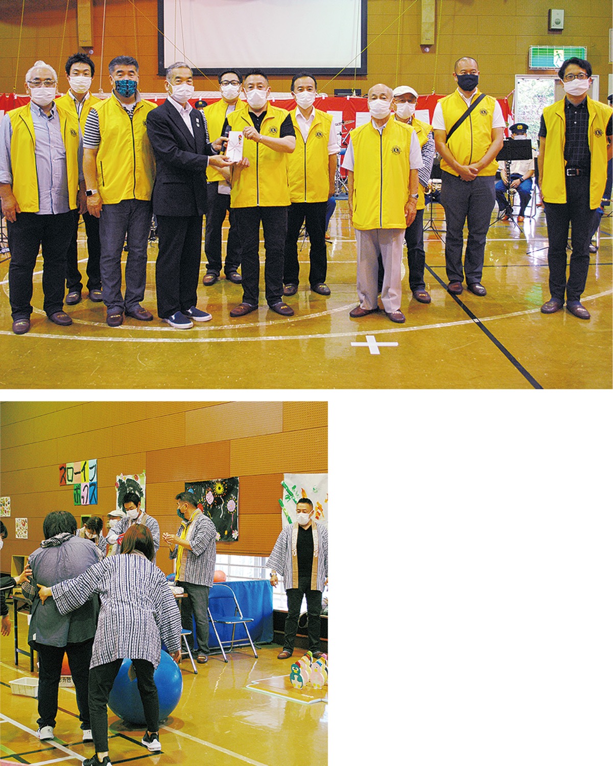 当日は、同LCの永井会長らメンバーおよそ10人が施設を訪問。永井洋一所長に支援金を手渡した。その後、ユニフォーム代わりの黄色いベストから景気のいい揃いの法被に着替え、館内で行われるアトラクションを手伝い、施設利用者らを楽しませた。