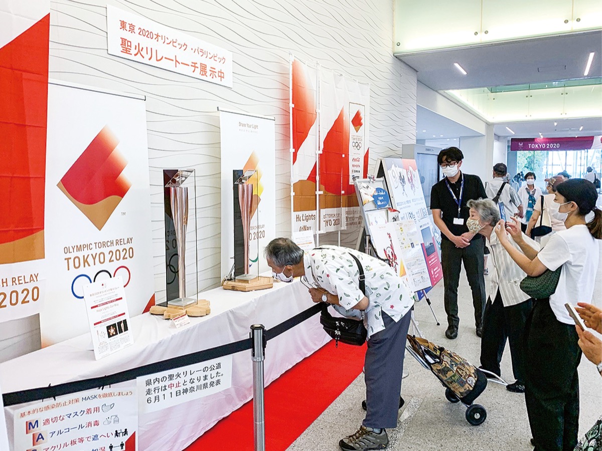 当初は県内でも聖火ランナーが火をつなぐ予定だったが、県は11日、新型コロナの感染症対策のため、公道走行中止を発表。辻堂太平台在住の女性(81)は「初めて見たけど素敵。聖火リレーが見られないのは残念だけど、いい記念になった」。鵠沼海岸在住の女性(51)も「沿道で見られないのは残念」としつつ、五輪都市ボランティアとして活動する予定といい、「コロナ禍で不安もあるが、少しでも気分を明るくして盛り上げたい」と話した。