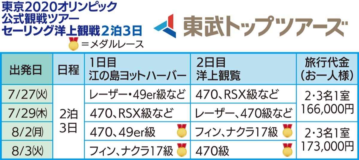東京五輪・パラリンピックのオフィシャル旅行パートナーを務める東武トップツアーズ(東京都墨田区)が、セーリング競技を生で観る「洋上観戦2泊3日プラン」の販売を開始した。