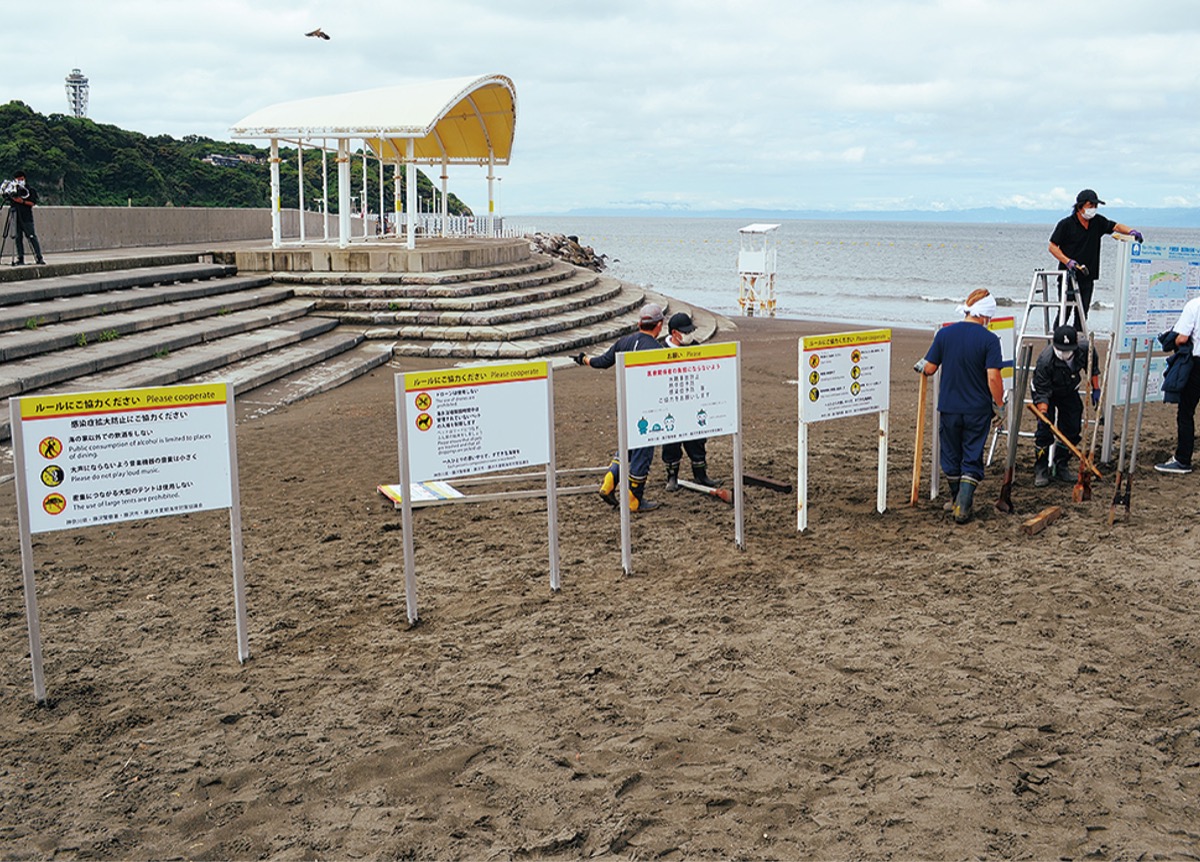 今夏2年ぶりに開設される市内3海水浴場(片瀬海岸西浜・鵠沼、片瀬東浜、辻堂)に先月29日、感染症対策など市独自ルールを周知する看板が立てられた。計40本が設置された。