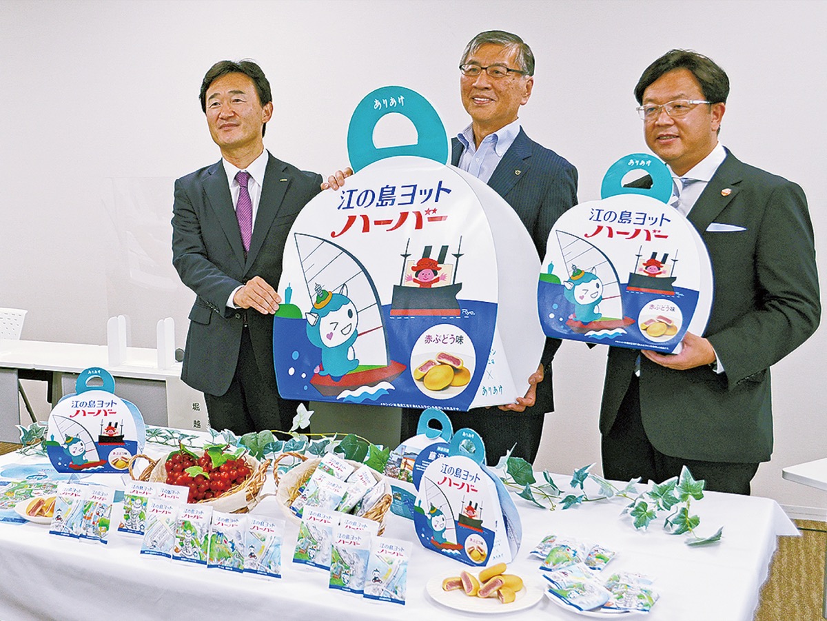 城南に藤沢工場を構えワインを生産しているメルシャン(株)、横浜土産でおなじみの「ありあけハーバー」など菓子製造販売を手がけ菖蒲沢に湘南工場を構える(株)ありあけ、藤沢市の3者が共同しこのほど、新たな藤沢の土産菓子が完成した。その名も「江の島ヨット”ハーバー”」――。