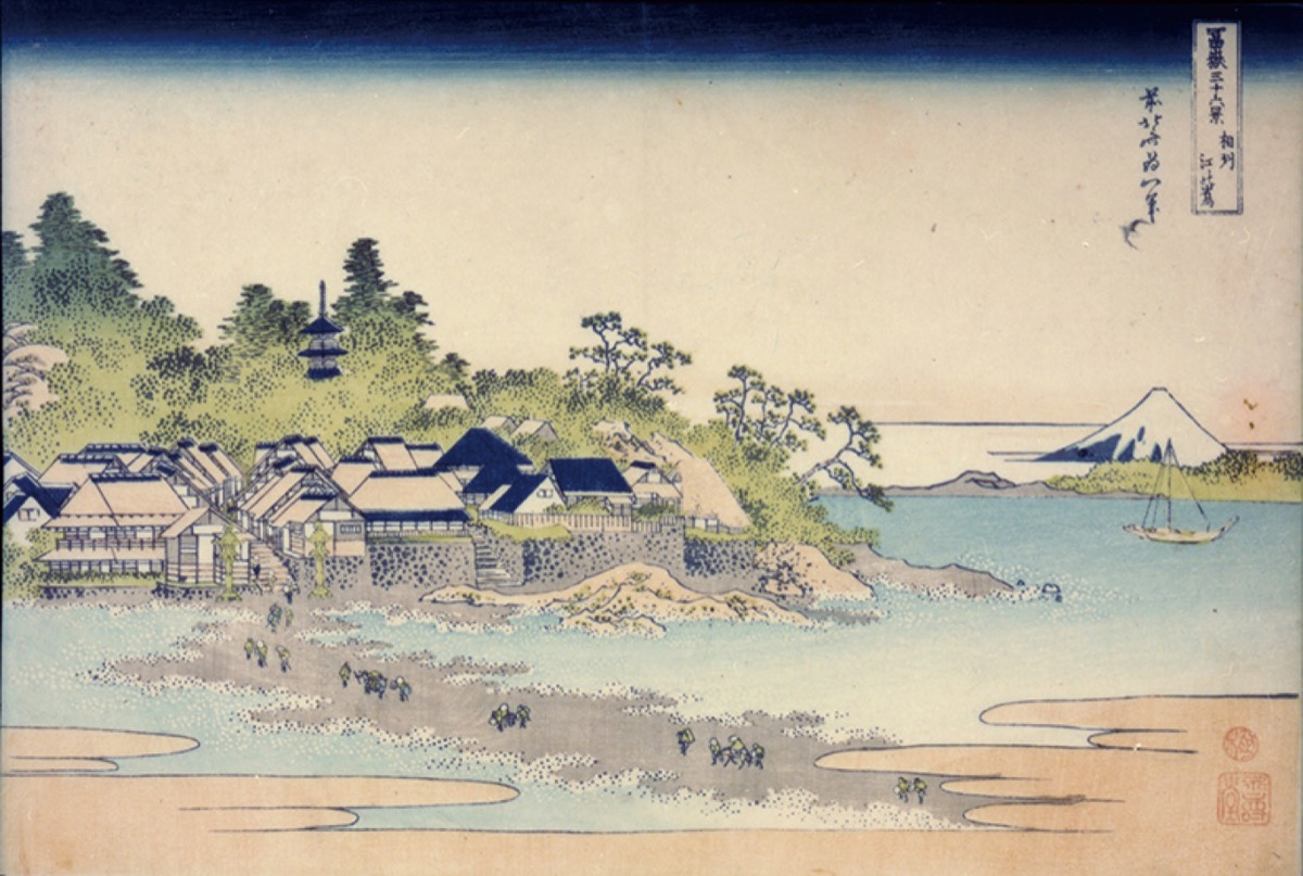 江戸中期以降は庶民の旅が盛んになり、東海道などの名所ブームが到来。江の島は関所なしに来られる観光地として広く人気の場所で、葛飾北斎の「冨嶽三十六景 相州江の嶌」=画像右下=のように、参詣自体を「観光写真」のように描いた名所絵も盛んに作られた。同課は「時代が変わっても、江の島は変わらない。当時の人と思いを通わせ、お気に入りの作品を見つけて」と話している。