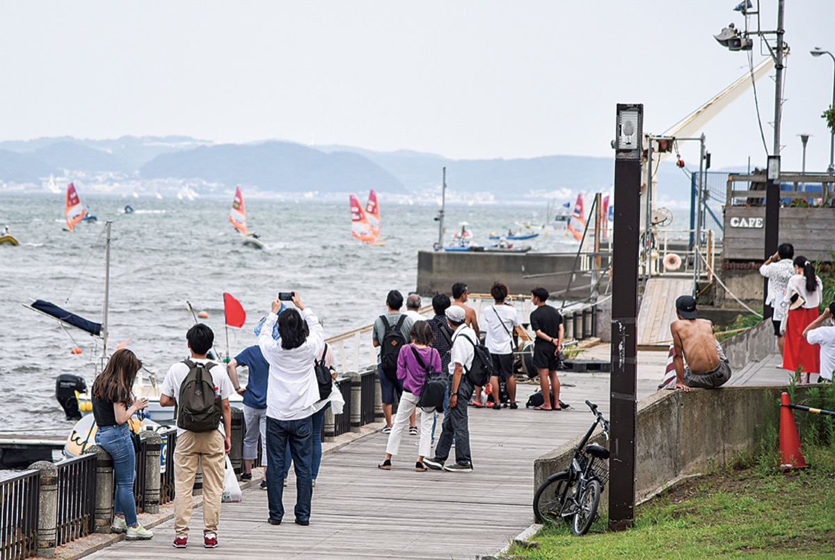 江の島ヨットハーバー横の岸壁には、カメラや双眼鏡を構え観戦する見物客の姿が数多く見られた。ウインドサーフィンの経験者だったという横浜市の70代男性は「日本でセーリングの試合が見られる機会は少ない。遠くからでも生で見たくて」と写真を撮影していた。