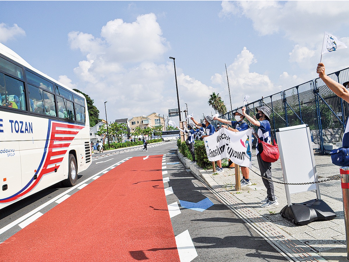大会初日となった25日、江の島ヨットハーバーにバスで入る選手たちを、都市ボランティア「シティキャストフジサワ」のメンバーが出迎えた。無観客により活動が中止となったため、藤沢市が代替イベントを用意したもの。