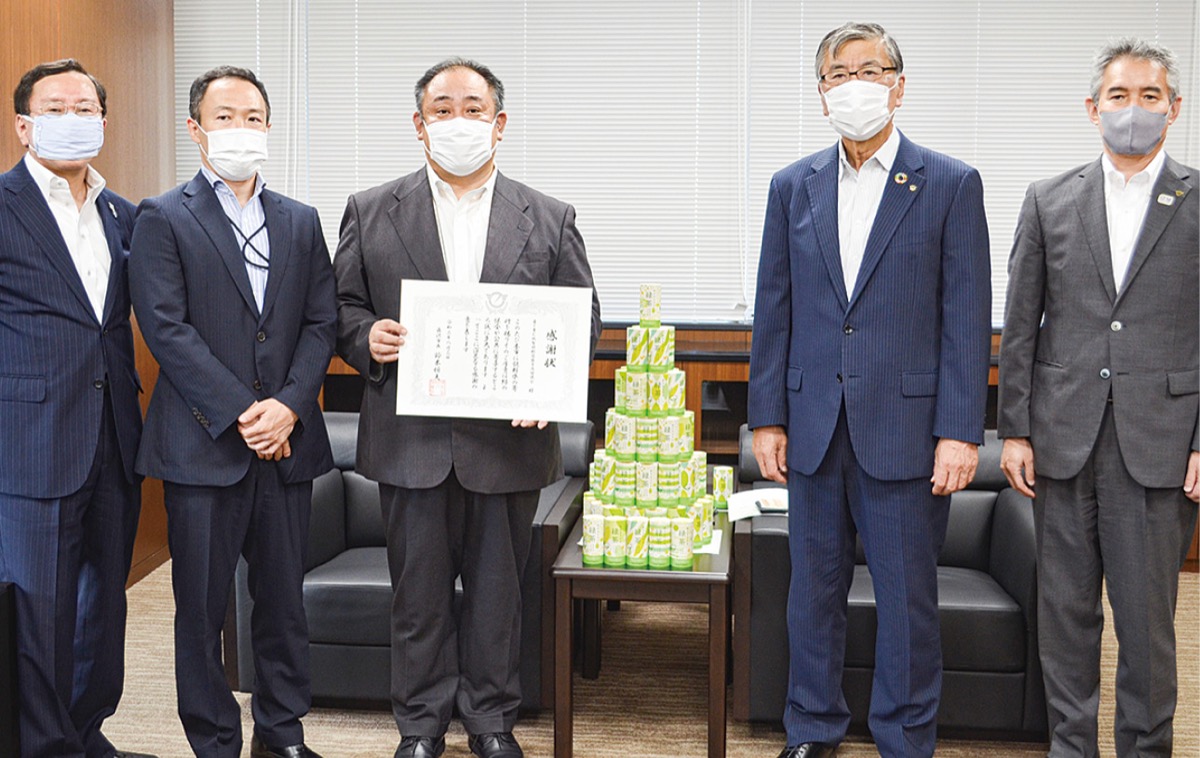 「森を育む紙製飲料容器普及協議会」はこのほど、地球温暖化防止に貢献できる環境性の高い紙製飲料容器「カートカン」に入った緑茶2000本を市へ寄贈した。市から同協議会へ3日、感謝状が贈呈され、同協議会事務局長の世木田大介さんは「藤沢市での活用をモデルケースとして、今後他でも普及に努めていきたい」と話した。