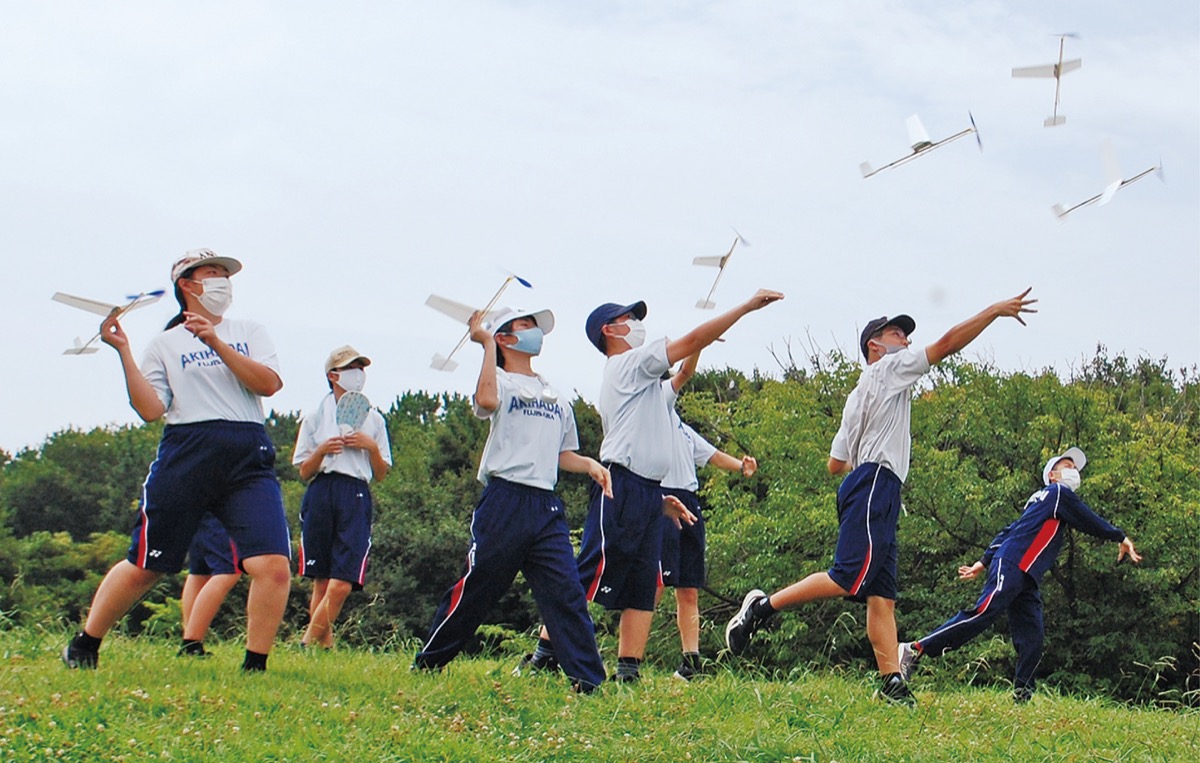 当日は微風が吹くコンディション。夏の晴れ渡った空のもと、生徒らが工夫を凝らした機体が、上昇気流をとらえると高く舞い上がり、公園内の木の上に落ちるものもあった。
