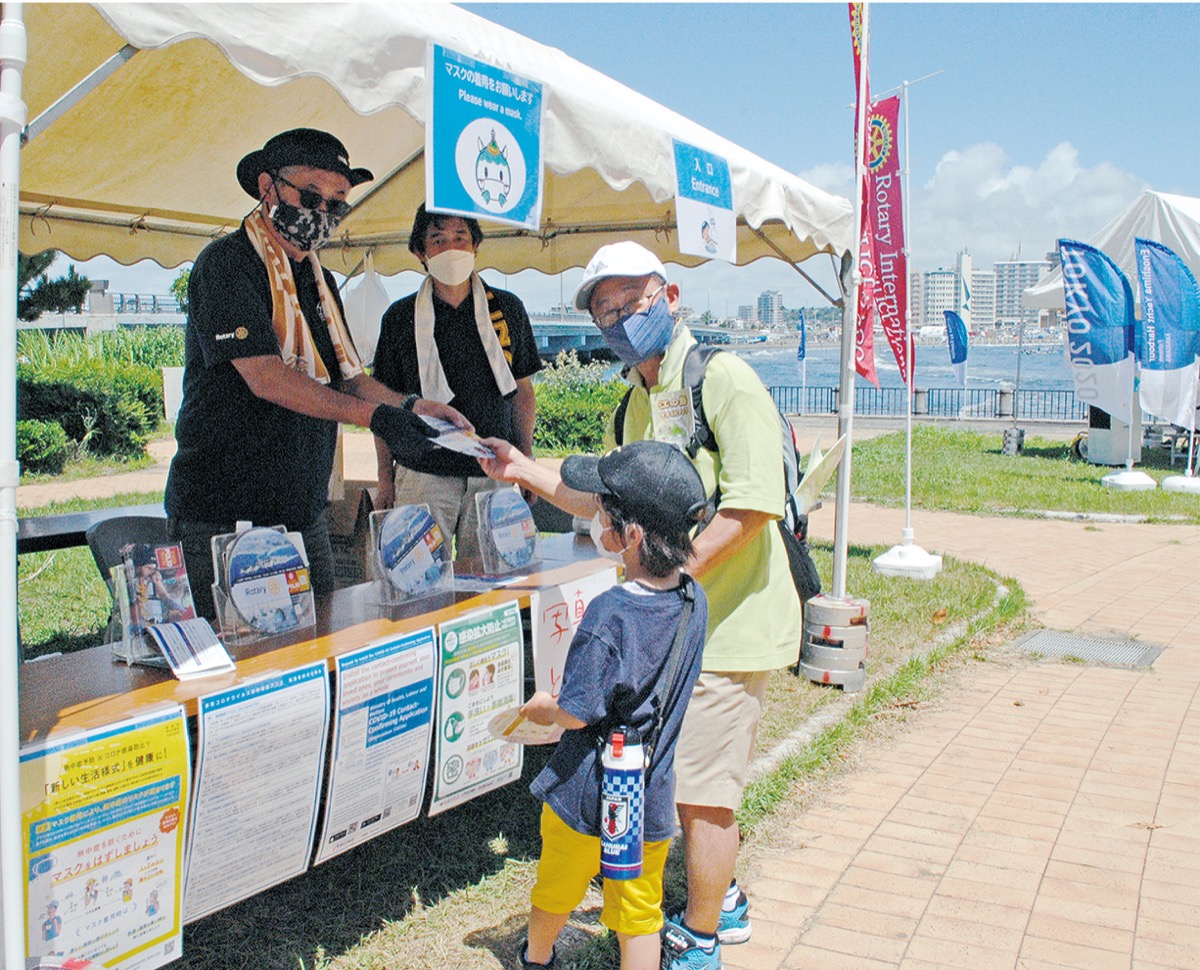 藤沢市内の9ロータリークラブは東京五輪セーリング競技が行われている江の島で、先月25日から8月5日までオリジナルうちわを配布した。県が設置したクールスポットの一角で感染予防を徹底し行った。取材した3日現在、用意した1万枚の内、8千枚余り配布し終えたとのこと。「猛暑が続くが、少しでも涼んでもらえたら」と話した。