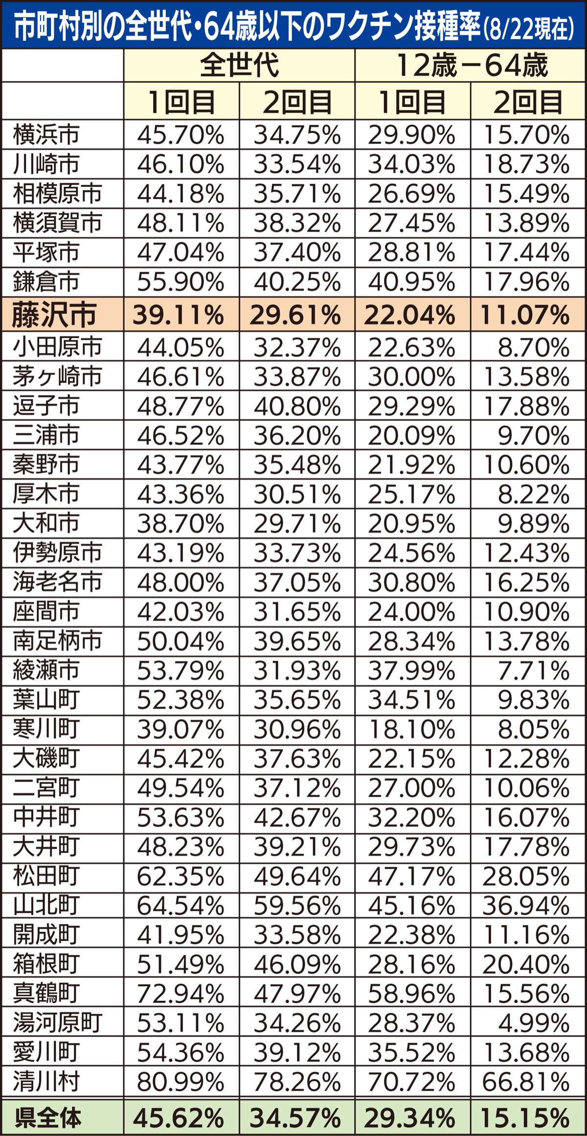 県の資料によると22日現在、藤沢市で全世代の1回目の接種を終えた人の割合は39・11%で33市町村中31番目、2回目は29・61%で最低だった。また12〜64歳以下の人口あたりの接種率は1回目が22・04%、2回目が11・07%で、全世代を含めた全ての接種率で県平均を下回る。