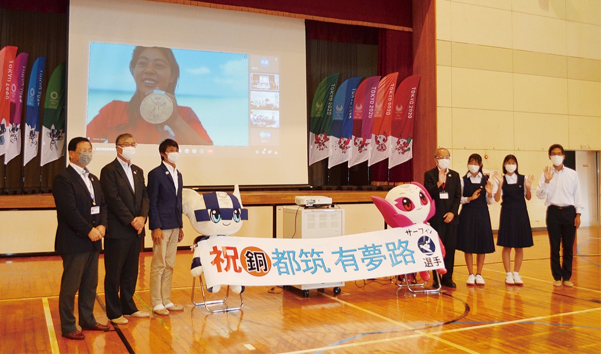 都筑選手の母校である湘洋中学校で7日、オンラインを使った贈呈式が行われた。鈴木恒夫市長から画面越しに賞状と藤沢マイスターのノグチガラスが海をイメージして制作した「世界に一つだけのメダル」が渡されると、オンライン参加していた同校生徒らから大きな拍手が送られた。都筑選手は「私がオリンピックで活躍することで、少しでも元気なニュースを届けられたかなと思うとすごいうれしかった」と笑顔で話した。
