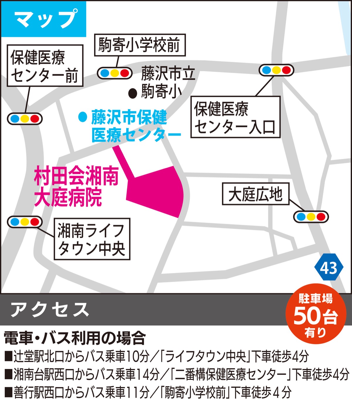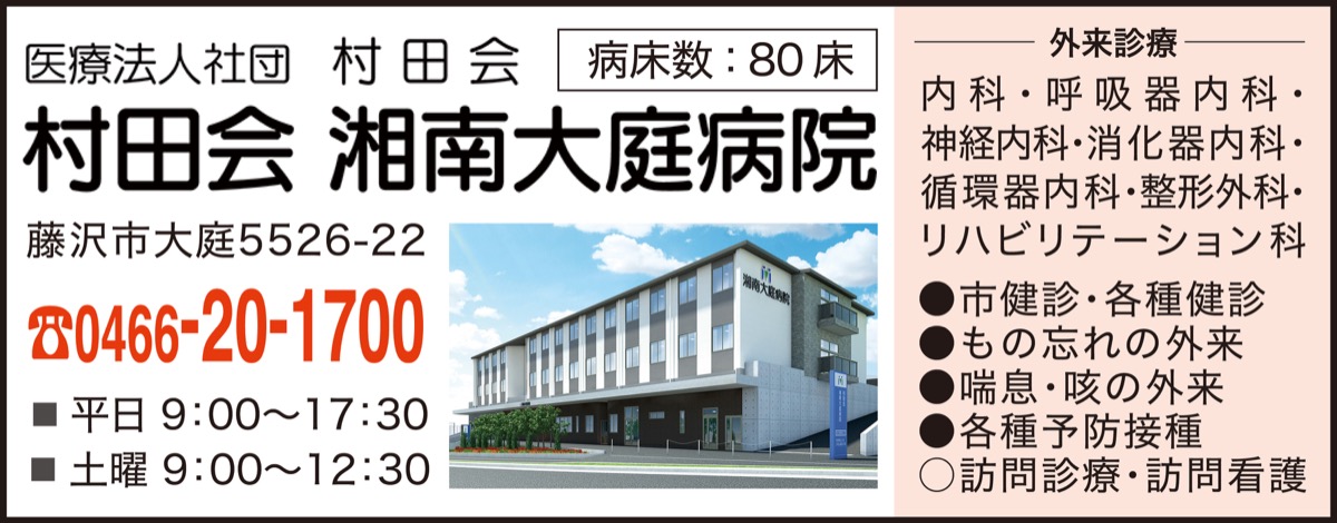 「地域のかかりつけ医でぜひ健診実施を。健康第一に一緒にコロナ禍を乗り越えましょう」と同院。通院のための無料巡回バスの運行は10月1日より開始。詳細は「村田会湘南大庭病院」のホームページへ。