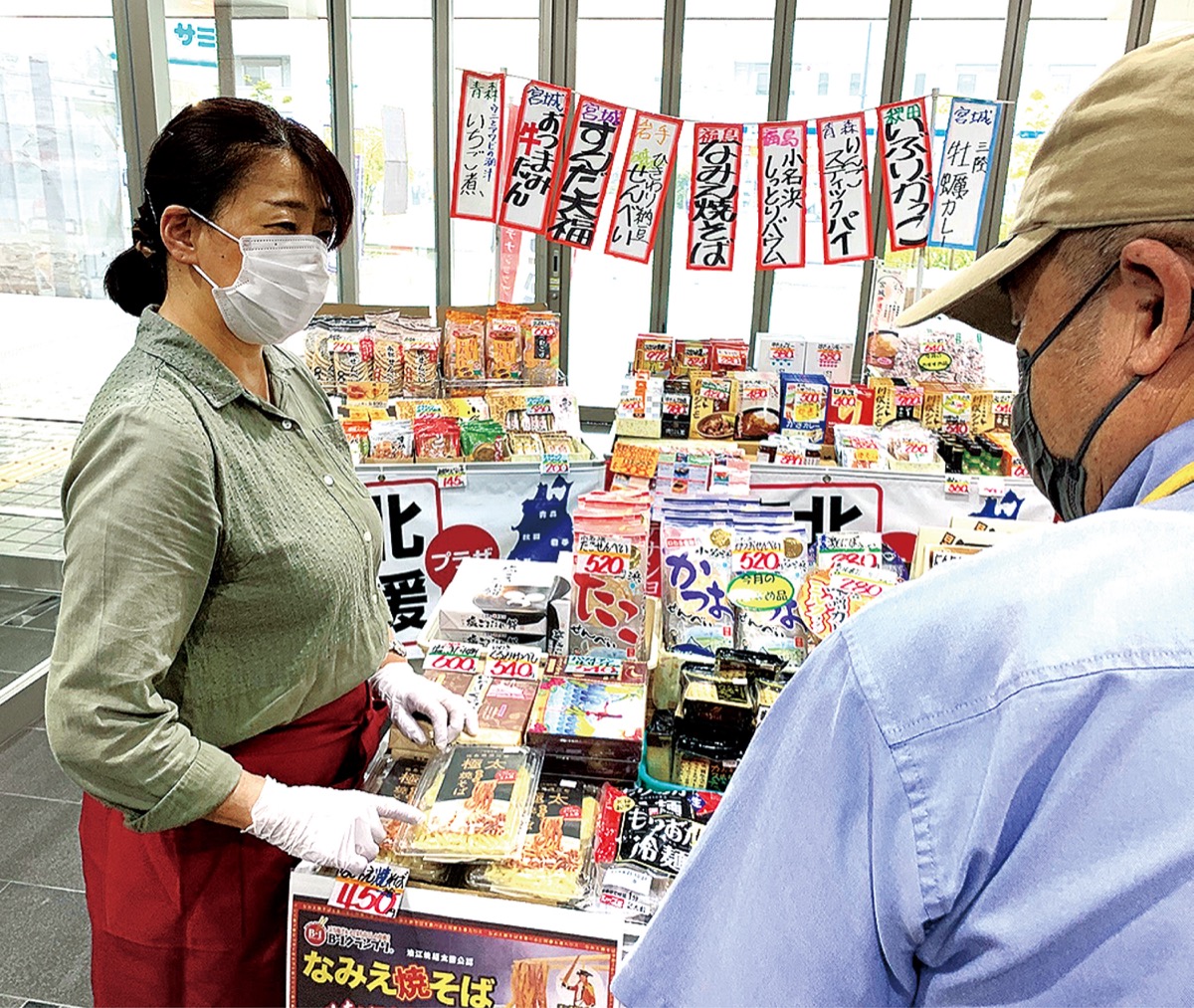 仕入れから商品の配置まで手掛ける杉原さん。客に説明できるよう、食べ方や販売元など商品に関する情報も積極的に覚えた。故郷で親しまれる同県浪江町発祥の「なみえ焼きそば」は人気商品の一つに。リピーターも増え、商品を気に入った客がSNSなどで発信してくれることも増えた。