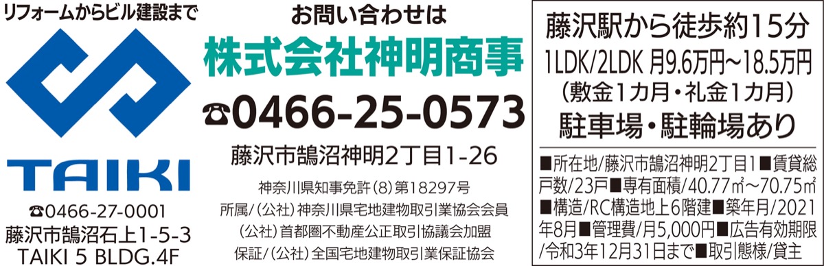 賃貸マンション「ケインズ湘南II」がこのほど、鵠沼神明2丁目に完成した。施工は大旭建業(株)。地域密着の不動産(株)神明商事は入居者を募集している。