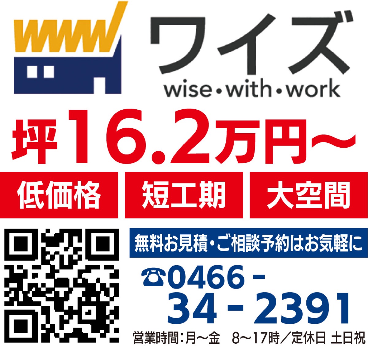 ワイズは藤沢市に本社を置き、神奈川屈指の施工実績を持つ総合建築会社「(株)門倉組」の新ブランド。同社建て替えやオーナーのインタビュー記事は二次元コードから無料で閲覧できる。