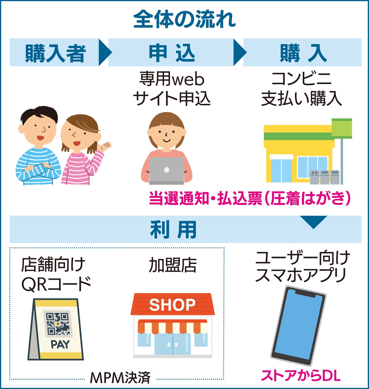 購入希望者はまず、専用ウェブサイト(https://www.knt-metro.co.jp/fujisawa/)から申し込み手続き。当選者にはハガキと払込票が郵送で届く。次にコンビニエンスストアで支払いを済ませ、専用アプリをスマートフォンなどにダウンロード。購入金額が自動チャージされた後、参加店に設置された二次元コードを通じて決済できるようになる。