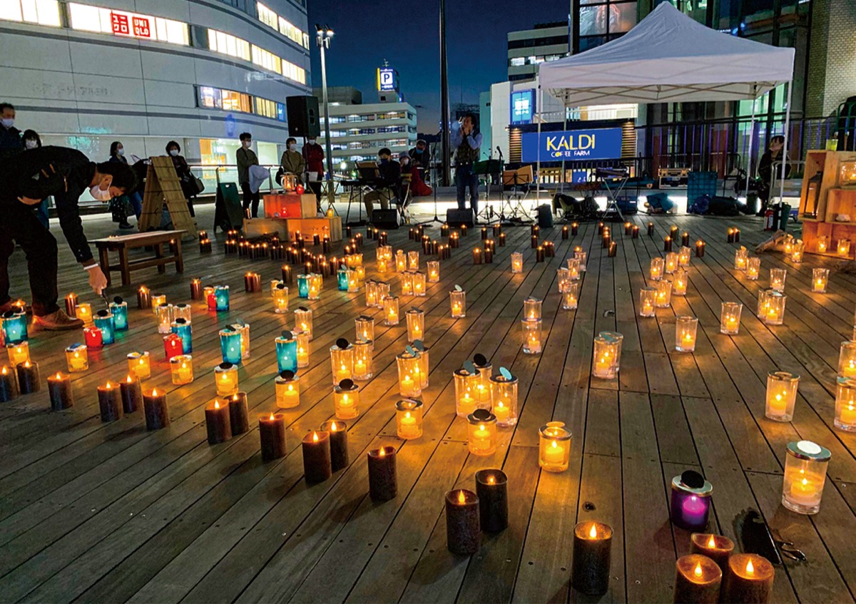 藤沢駅北口のサンパール広場で約400基のキャンドルが幻想的な雰囲気を演出している。江の島サムエル・コッキング苑で開催中の「湘南キャンドル」(〜11月7日)のサテライトイベントで、きょう29日まで。