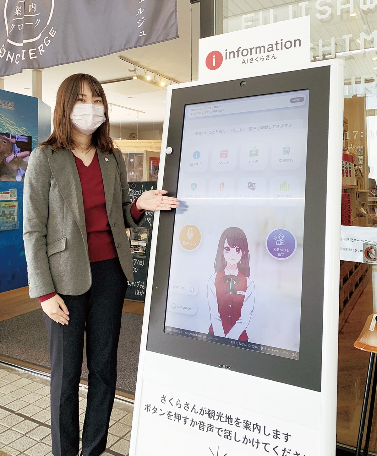 観光案内版は縦約160cm×横約60cm。タッチパネルを操作したり、音声マイクに向かって質問すると画面上の女性キャラクター「AIさくらさん」がイベント情報や飲食店、宿泊施設までの行き方などを案内する。英語と中国語への切り替えも可能で、外国人観光客の需要も踏まえた。