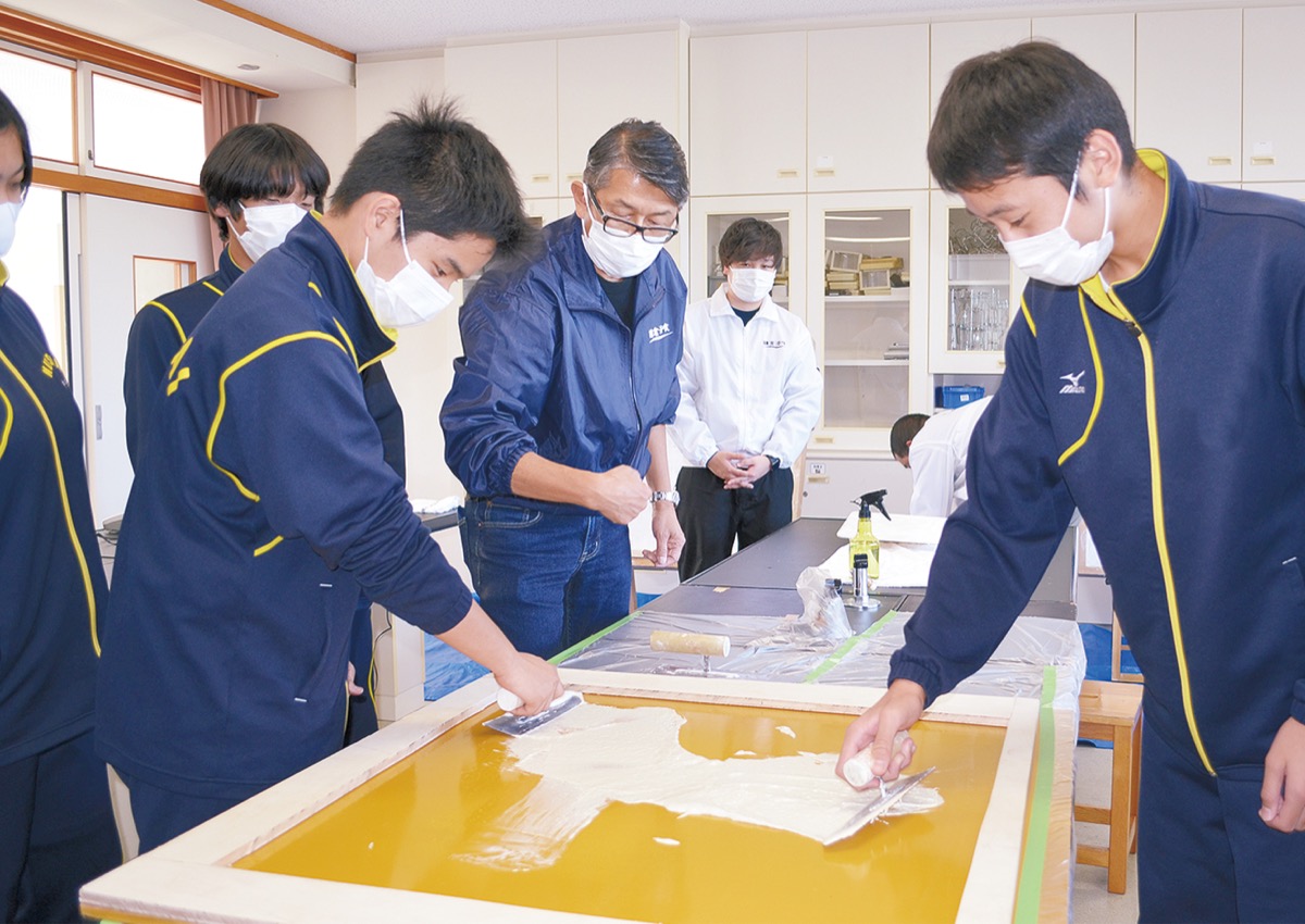 左官業を手がける(株)木本工業所が行った授業では、国宝級の城や寺社仏閣などで使用される「本漆喰」を塗る体験を実施。生徒たちは「国宝級ってことは慎重にやらなきゃ」「思うようにできなくて難しかったけど、貴重な経験ができて楽しかった」などと話していた。