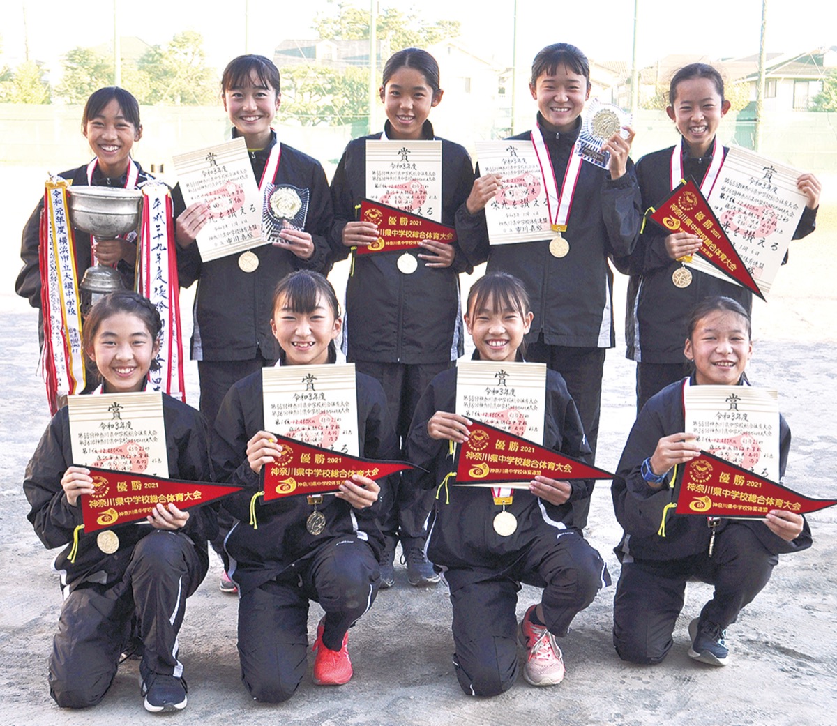 県中総体の駅伝競走大会が6日、横浜八景島・海の公園で行われ、鵠沼中学校陸上部が、女子の部(5区間12・48Km)で、45分23秒で初優勝を飾った。男女通じて藤沢市内の中学校が優勝するのは初の快挙。メンバーらは「たすきをつないで目標の優勝が実現できてうれしい」と話した。