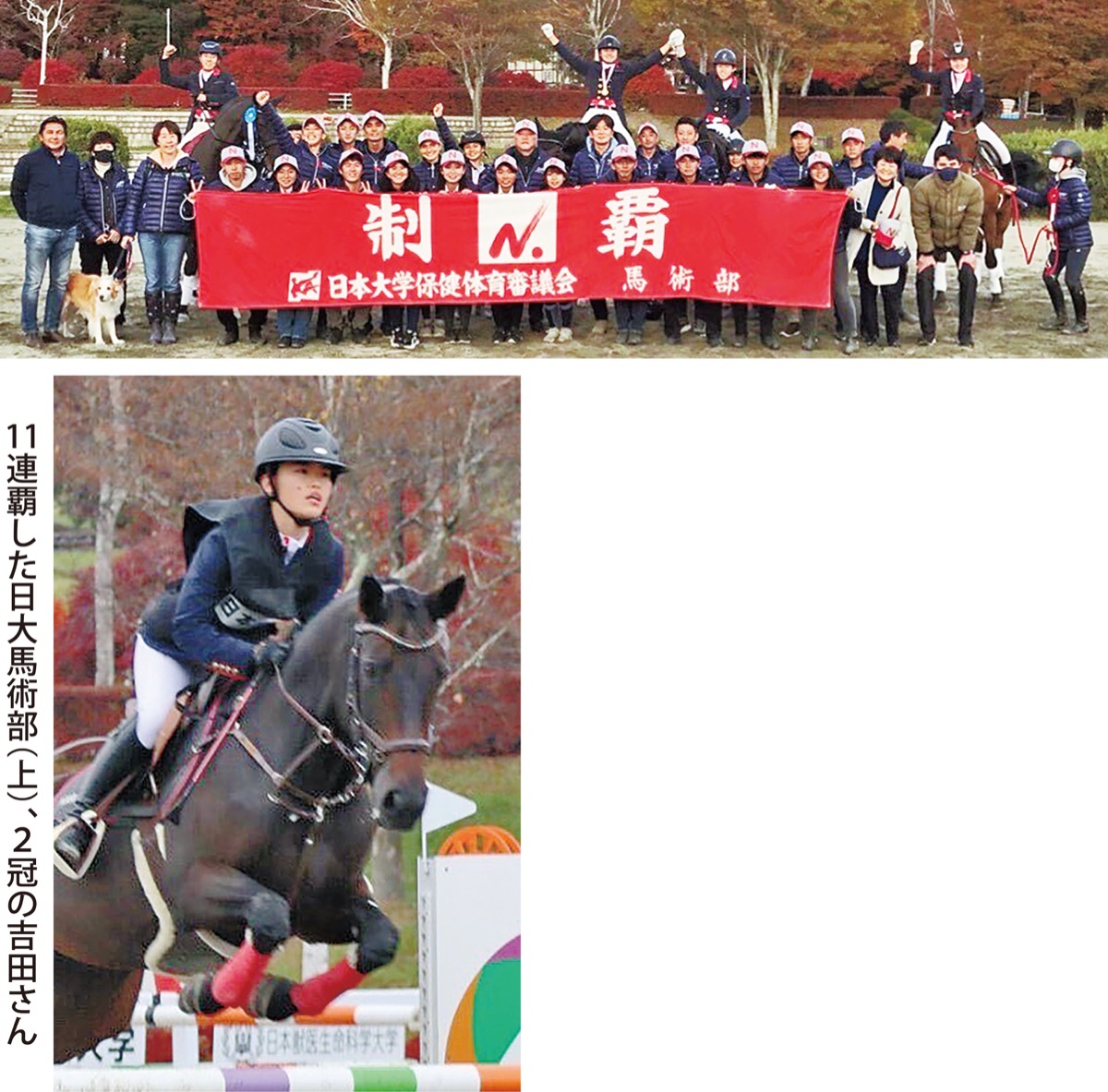 日大馬術部は、吉田ことみさん(3年)が障害飛越と総合馬術で2冠を飾り、馬場馬術で楠本將斗さん(3年)が優勝。他の出場選手も上位に入り団体戦も制し「完全優勝」を飾った。3種目総合では、2位の立命館大に大差をつけ1229ポイントを獲得した。