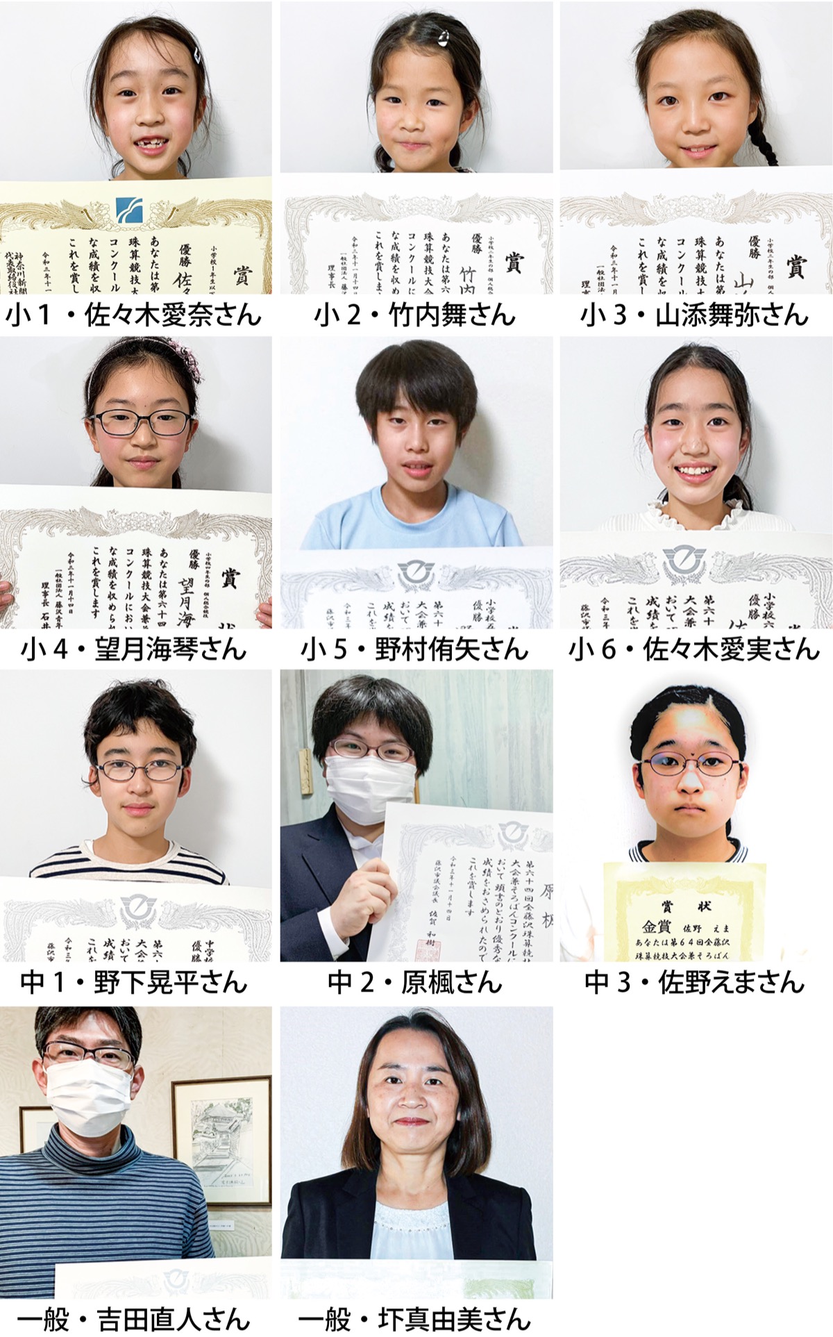 【個人総合】小学1年生▽佐々木愛奈/小学2年生▽竹内舞/小学3年生▽山添舞弥/小学4年生▽望月海琴/小学5年生▽野村侑矢/小学6年生▽佐々木愛実/中学1年生▽野下晃平/中学2年生▽原楓/中学3年生佐野えま/一般▽吉田直人・圷真由美