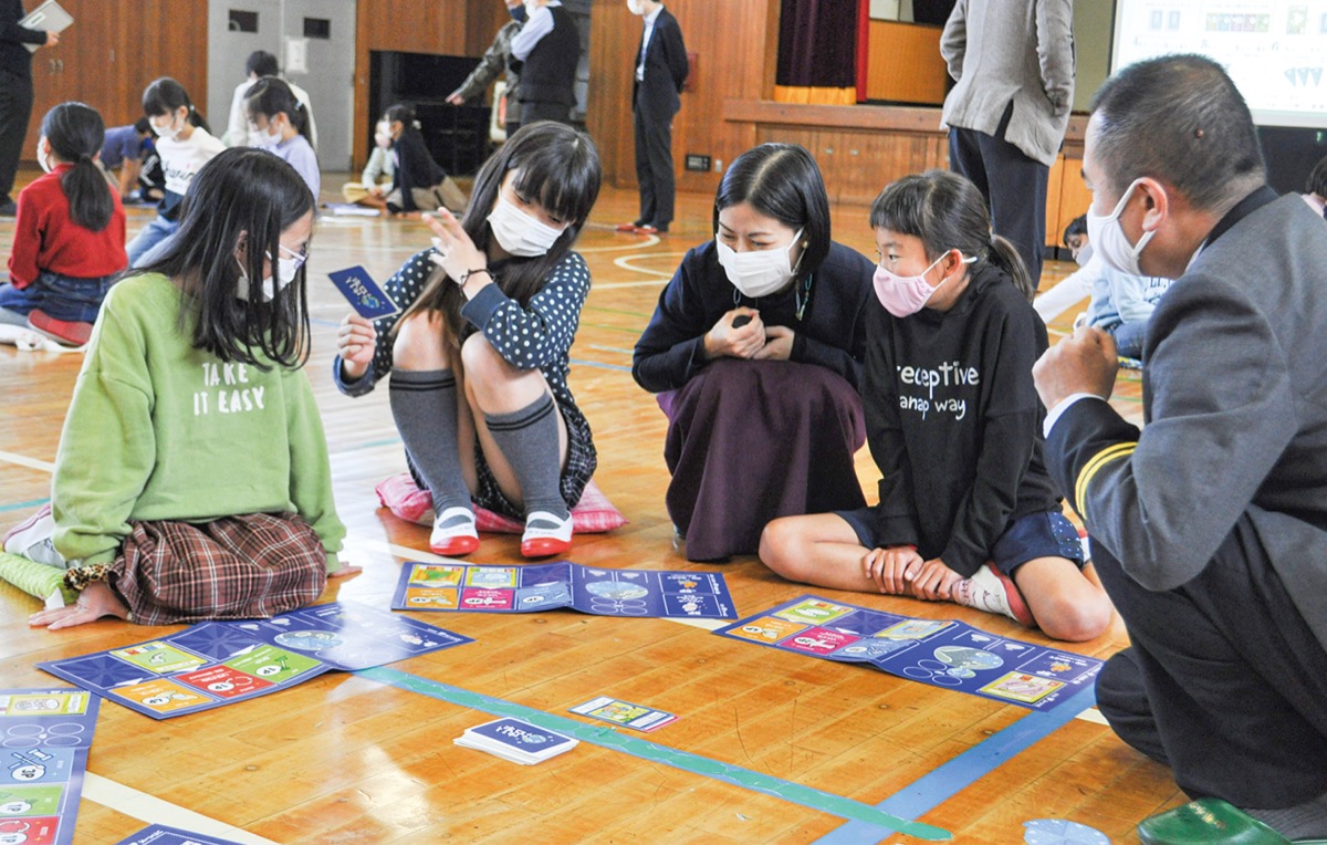 4年生2クラスの児童が参加。一般社団法人ゼロ・ウェイスト・ジャパン代表理事でゲーム考案者の坂野晶さんが説明した後、5人前後のグループに分かれた。