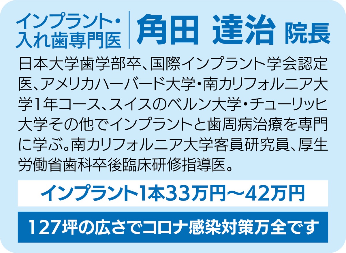 インプラント治療の利点は自分の歯とまったく変わらない機能と審美であること。神奈川県でも屈指の1万本以上の症例数と治療歴32年以上の長い臨床経験を持つ『鵠沼アルカディア歯科・矯正歯科』のインプラント専門医・角田達治院長は、「インプラント成功率99・9%。10年は当たり前、20年から30年持ちます」と話す。また、同院には大学病院の手術室に準じる滅菌の完全隔離されたオペ室があり、全身安全管理モニター・点滴設備・笑気酸素吸引設備・大型医療空気清浄機(除菌)・滅菌機材管理庫・PCガイデッドサージェリー機器など、先進の手術関連機器設備を完備。インプラント手術も通常の埋入手術から骨造成手術(GBR)などの高度な手術も多数手がけている。「インプラントは、世界的インプラントメーカー・スイス『ストローマン社』製を使用しています。インプラント手術とその上の被せ物やインプラント以外の歯の虫歯、歯周病、咬合治療も総合的(包括的)治療を行い、経験豊富なワンドクターで行うことにより、20年、30年持つインプラントが可能なのです」と角田院長は話す。