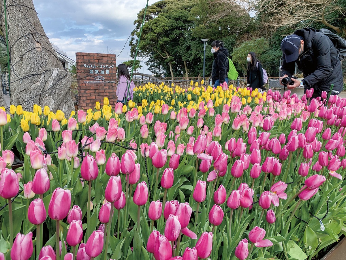 江の島サムエル・コッキング苑に植栽されているウインターチューリップが見頃を迎えた。赤や白、黄色など色鮮やかな花々が苑内に彩りを添え、一足早い春の到来を演出している。