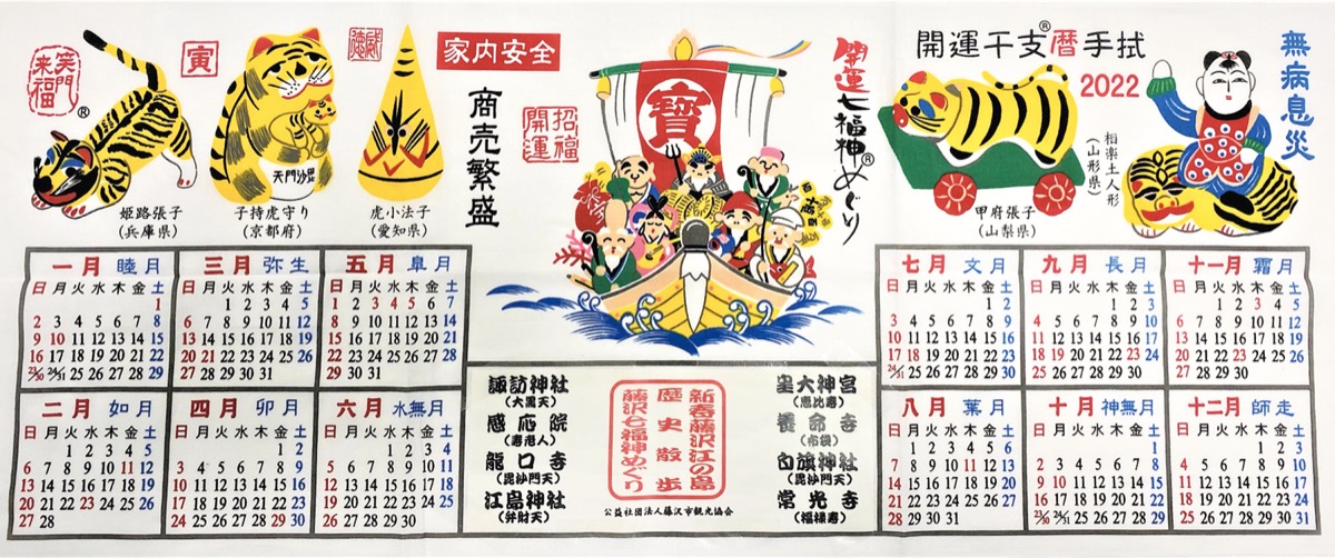 8カ所全てのスタンプを押印すると、七福神や干支のトラが描かれた「開運干支暦手拭」=写真=が200円で購入できる(2枚目以降300円・500円の記念色紙購入で1枚無料)。