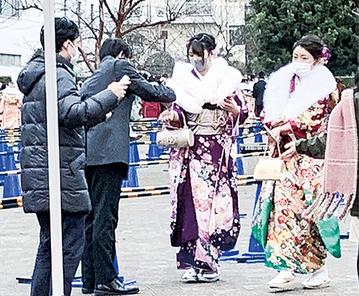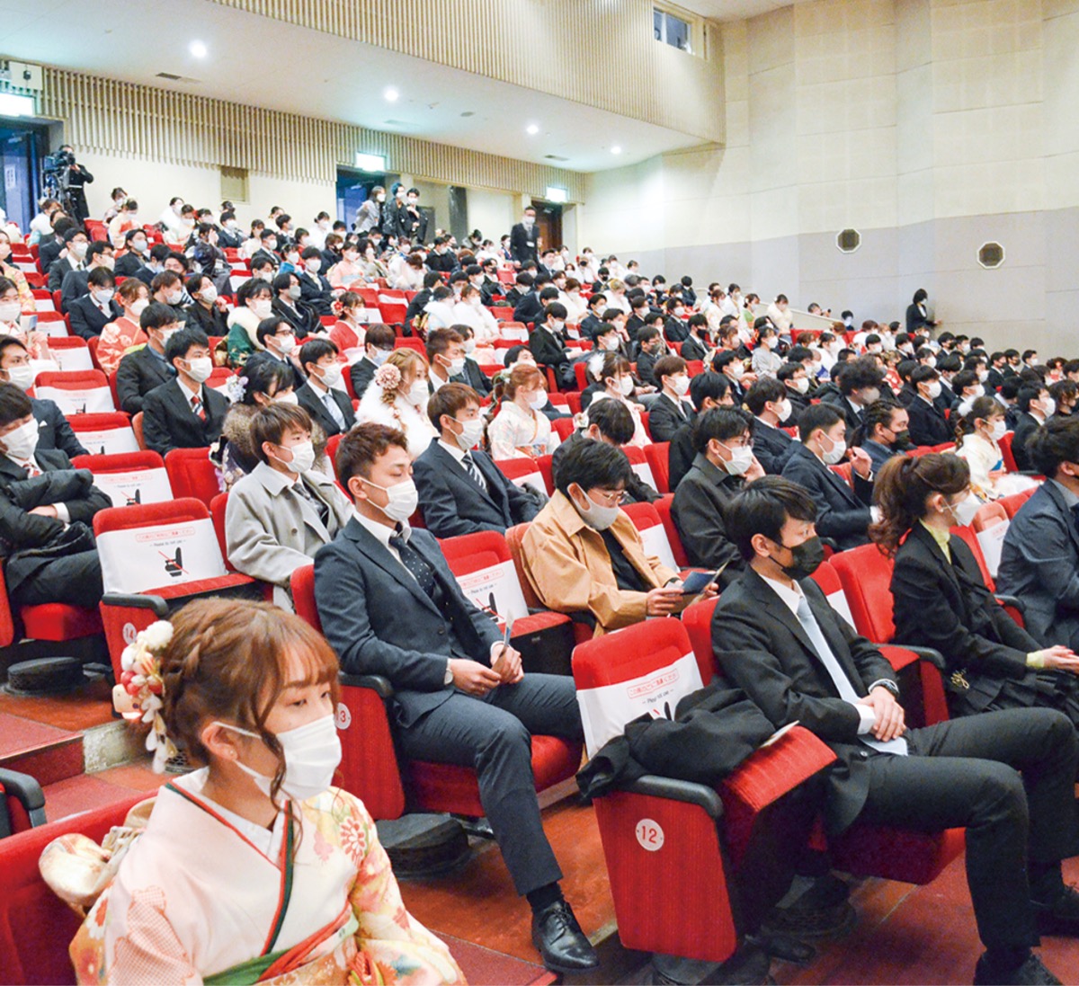 成人式が10日、2年ぶりに藤沢市民会館で開かれた。式典は新型コロナウイルスの感染拡大防止のため、市内をエリア分けした3部制で実施。検温や消毒、マスクの着用、会場内の「3密」防止に加え、式典の時間短縮、一部オンライン配信を実施するなど、感染対策を徹底して行われた。
