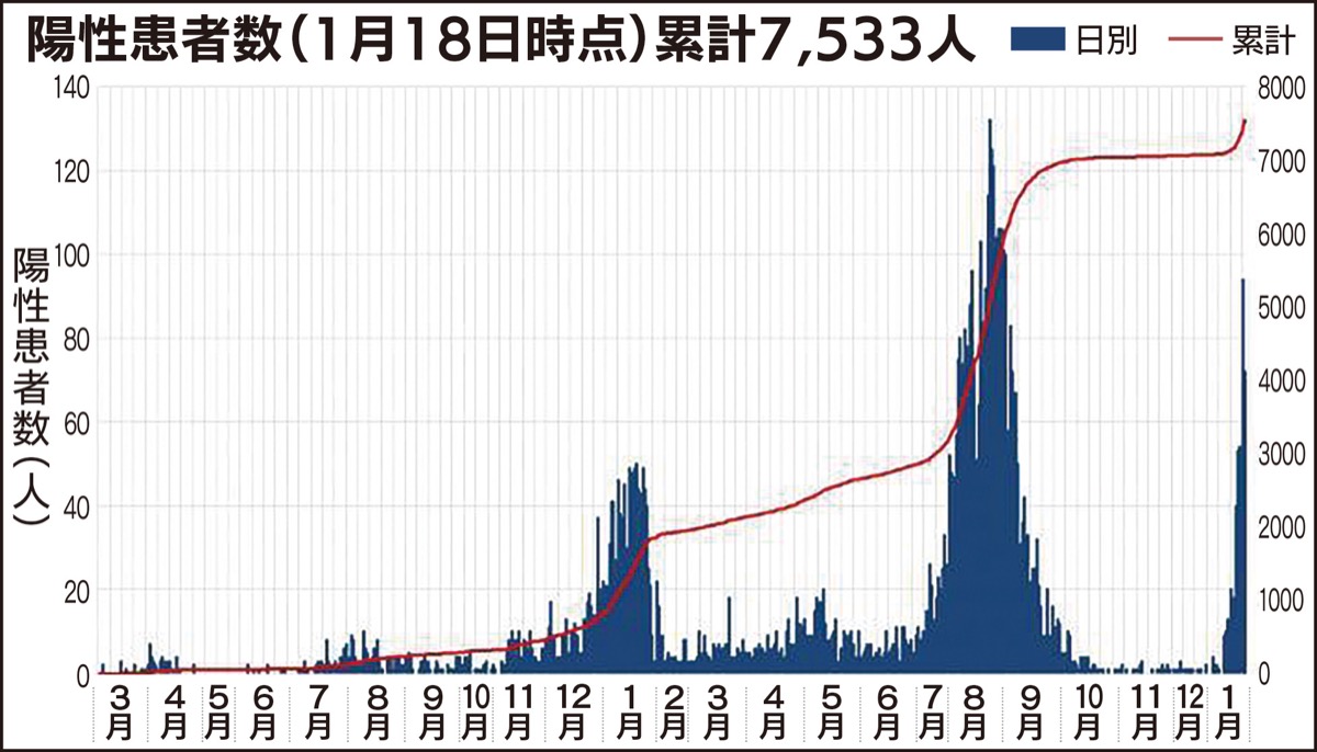 直近1週間(1月12〜18日)の新規感染者数は383人。前週(5〜11日)の72人から5倍超に増えた。