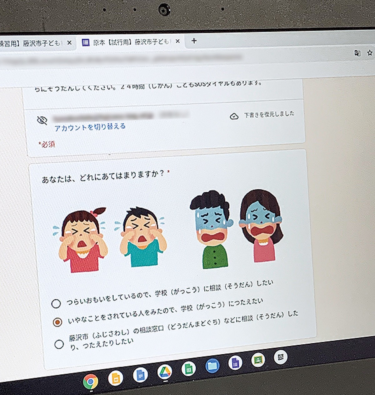 藤沢市教育委員会はこのほど、市立小中学校に通う児童生徒に配布されている学習用タブレット端末を通じて教員にいじめなどの相談ができる「市子ども相談フォーム」を導入した。1月末までを試行期間とし、課題を整理検証した上で近く本格運用を目指す。児童生徒がSOSを発信しやすい環境を整備し、早期対応や防止を図るのが狙いだ。