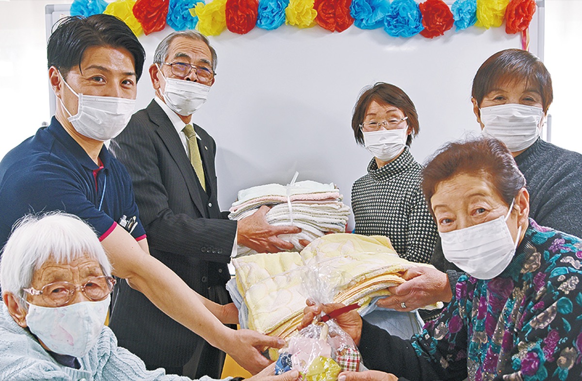 高齢者施設の理事長の川島進さんは「地域の皆さんが一つひとつ手作りして頂いたもの。何枚あっても役に立つ。大変ありがたい」と感謝を述べた。