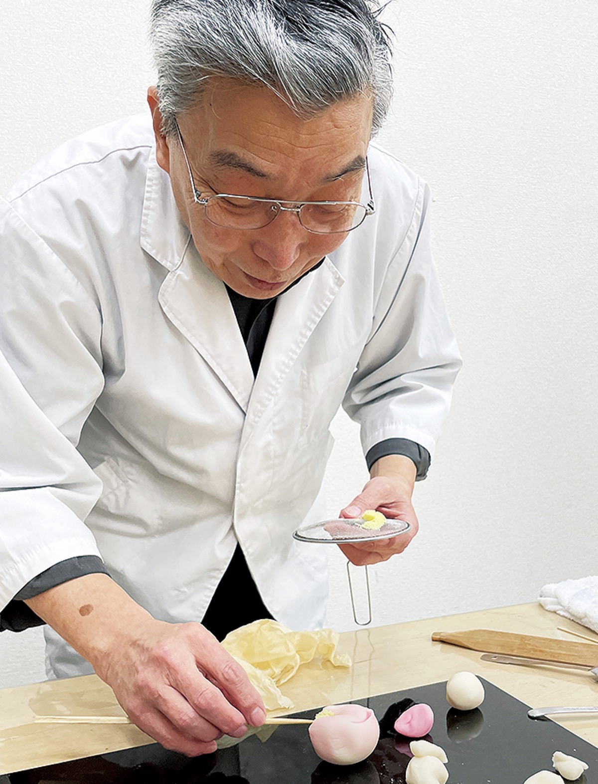 桃色、白、黄色、自然の花々から摘み取ったような柔らかな色彩の練りきり生地の玉たち。転がす、つまむ、ひねるといった簡単な所作をしているだけなのに、見る間に美しい和菓子へと変貌する。見た目にも美しく、味は言わずもがな。「日本の四季同様、五感で楽しめるのが和菓子の魅力」と微笑む。全国の品評会で様々な賞を獲得してきた工芸菓子の名手の技の秘密を問うと「一にも二にも、とにかくよく見ることだよ」と目を細める。