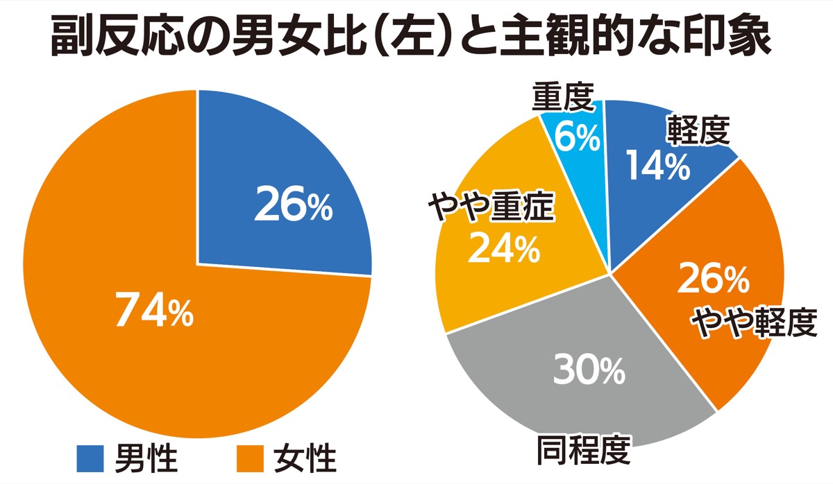 副反応調査には591人が協力し、93%が接種部位の痛みを感じると答え、約40%が37度以上の発熱があったと回答した。そのほか倦怠感、頭痛、筋肉痛などの症状もあった。