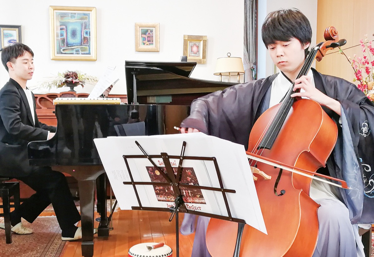 12日の午後2時、メンバーの自宅に音楽デュオ「ラ・テモテ」の2人の演奏が響いた。ピアノとチェロを中心に、クラシックなど耳なじみのある幅広いジャンルの8曲を披露。その模様はユーチューブを通してライブ配信された。本来なら広場で演奏するはずだった2人。ピアノ担当の瀬筒拓磨さん、チェロの湯原庸輔さんは「結成したものの演奏の場がほとんどなかった。声をかけてくれてとても嬉しい」と声を揃えた。「広場オープンも間近。機運も上げていきたい」と清水さん。今後の配信予定は同団体ホームページなどで発表される。