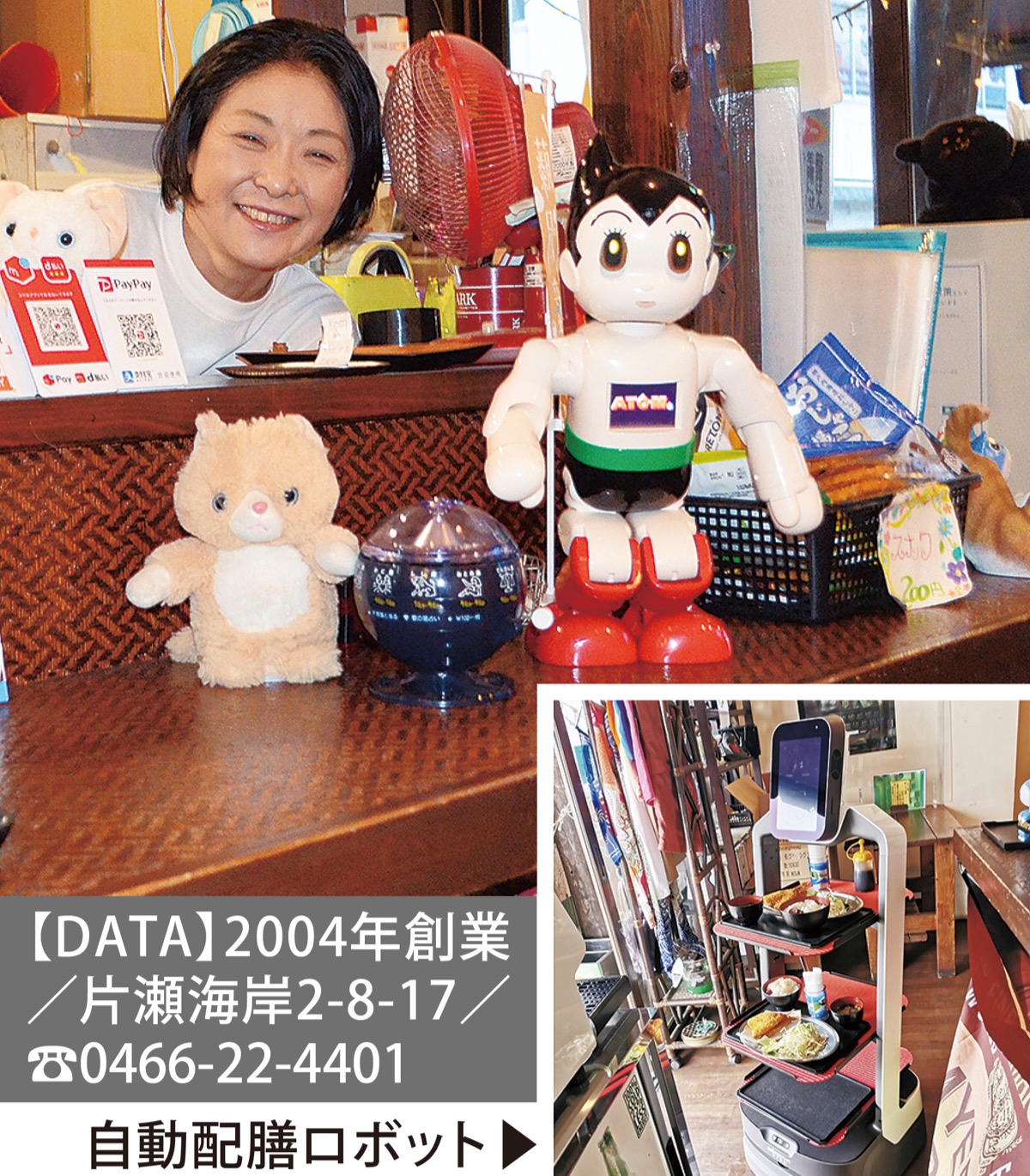 小田急線片瀬江ノ島駅の目の前にある飲食店「道楽やねこん家」。店内には、ぬいぐるみや可愛らしい見た目のロボットがそこかしこに。「鉄腕アトム」がしゃべる声も聞こえてくる。