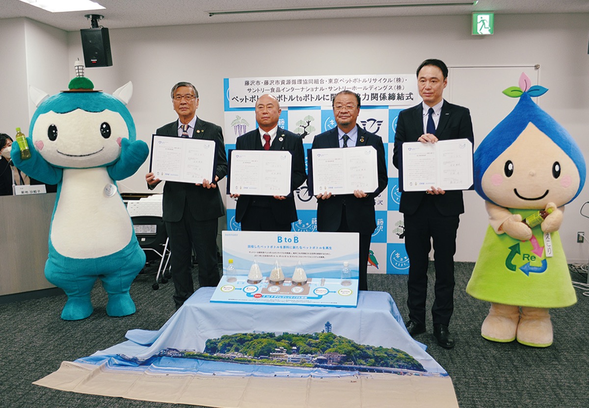 藤沢市は4月から、回収したペットボトルをペットボトルにリサイクルする「ボトルtoボトルリサイクル」事業を開始する。先月24日には、藤沢市資源循環協同組合とサントリーホールディングス(株)、東京ペットボトルリサイクル(株)(TPR)の3者と協定を締結した。