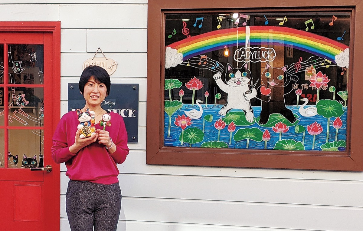 鵠沼海岸の美容院「LADY LUCK」のウインドウアート=写真=は、鵠沼アートフェスの一環で作成。イベント終了後も、オーナーの好意でそのままに。テーマは「繋がる猫愛、広がる笑顔」。道ゆく人が笑顔になるよう、オーナーの愛猫2匹が蓮池公園を舞台に歌い踊る。自身も保護猫2匹と暮らし「猫好きは惹かれ合う」と笑顔。