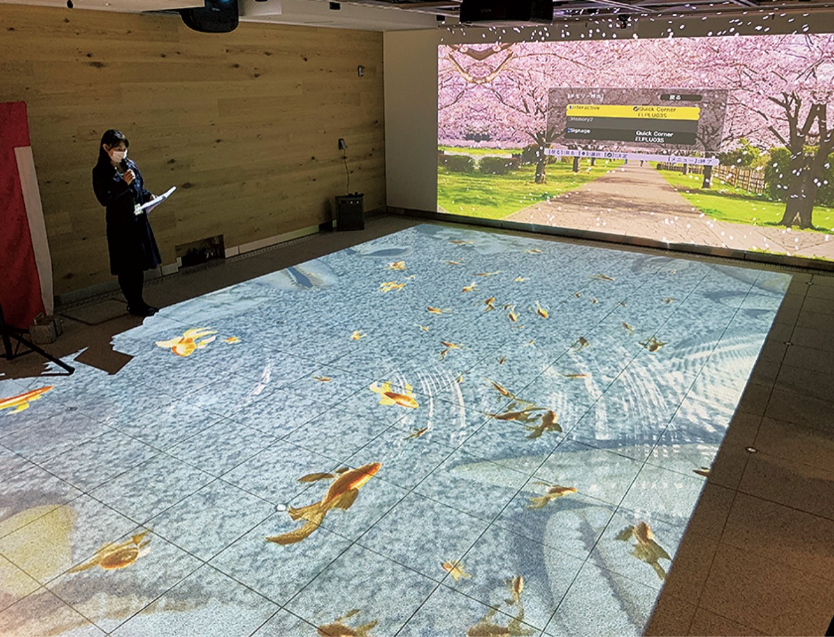 広場部分には映像と動作が連動する「インタラクティブ(双方向)システム」=写真=を導入した。この日は、藤沢にちなんだ四季折々の景色が投射され、式典参加者らが触れながら映像の変化を体験した。