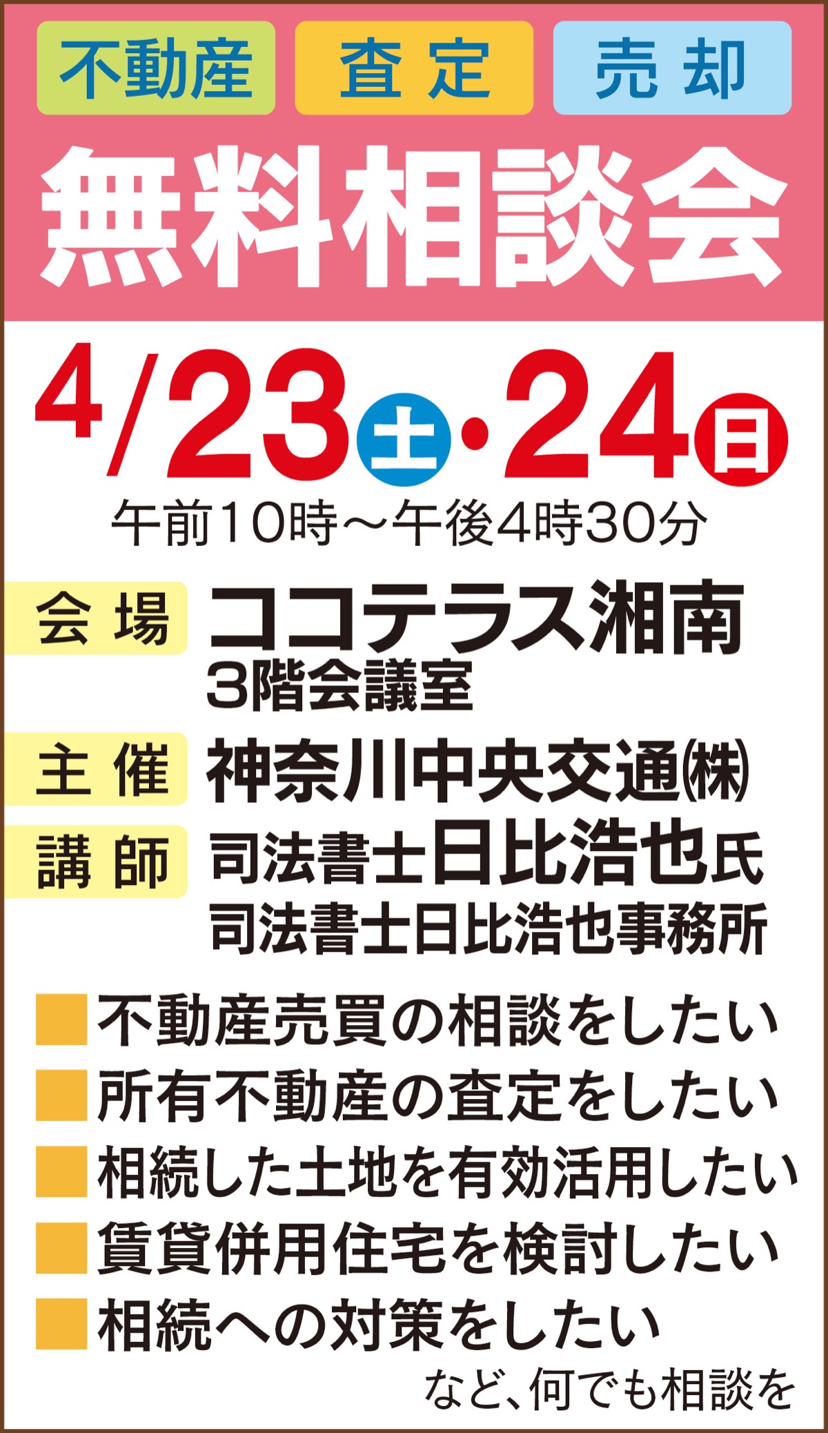失敗しない不動産の相続・運用のために、司法書士と宅地建物取引士が市民目線で親身に応じてくれる無料相談会が4月23日(土)と24日(日)、辻堂駅そばのココテラス湘南で開かれる。主催は神奈川中央交通。