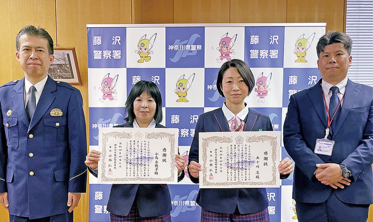 藤沢署は7日、道に迷い行方不明になっていた高齢者を保護した功労を称え、湘南ヤクルト販売(株)の委託販売員、通称「ヤクルトレディ」の五十川忍さん(42)と小島菜穂子さん(41)を表彰した=写真。