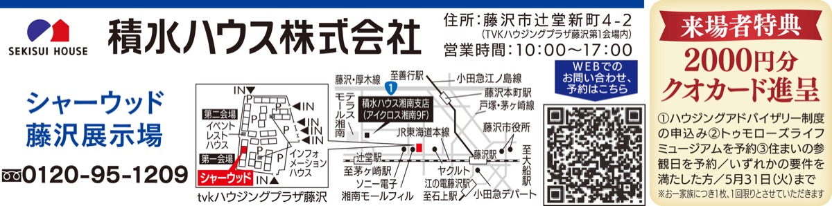 来場者特典として2000円分のクオカードを進呈(※【1】ハウジングアドバイザリー制度の申込み【2】トゥモローズライフミュージアムを予約【3】住まいの参観日を予約/いずれかの要件を満たした方)。5月31日(火)まで。