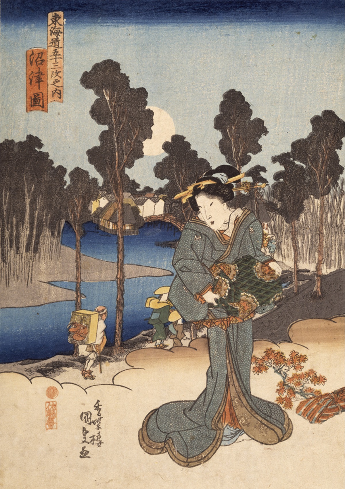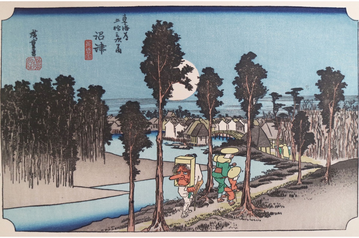 国貞と広重は、ともに1800年頃に活躍。構図が類似している理由は、当時売れっ子浮世絵師だった国貞に、同じく売れ筋だった広重の「保永堂版東海道」に目を付けた版元が、真似て描くよう依頼したことがきっかけと考えられている。