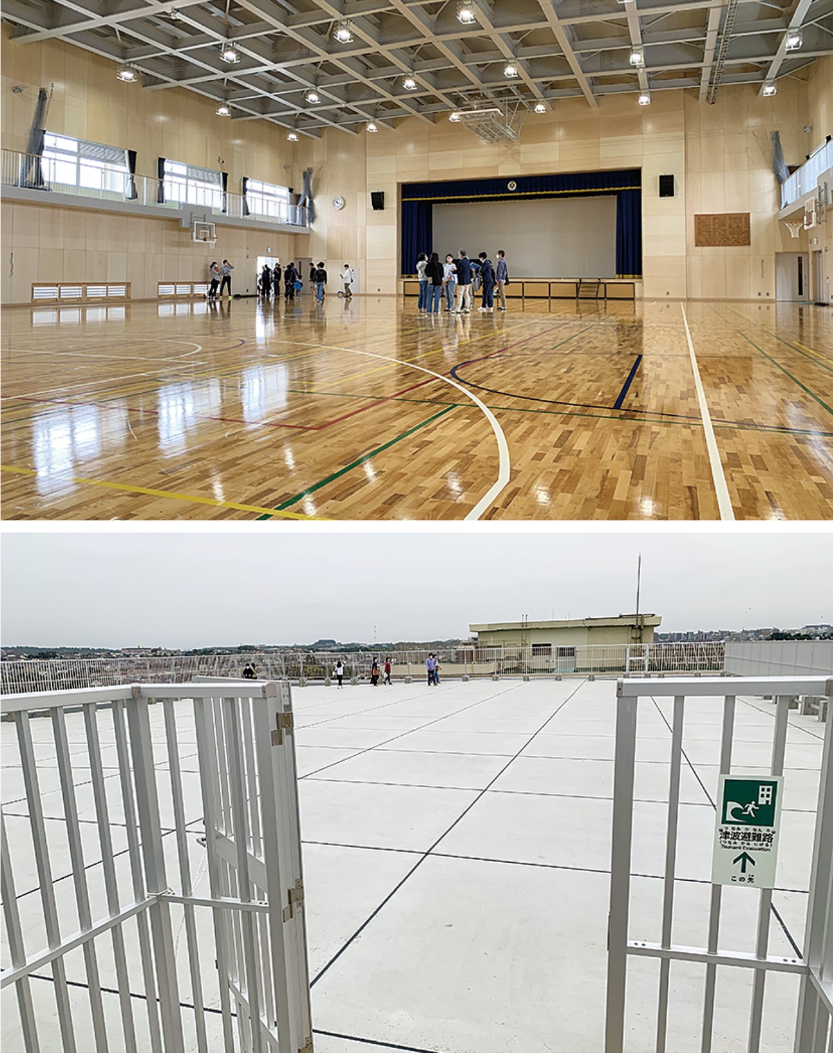 同校は海岸から近く、最大で浸水深3〜4mの津波を想定。4階と屋上は津波避難場所に指定しており、市によると合わせて約2300人、今後建て替えになる校舎部分と合わせると5千人以上の避難が可能になる。